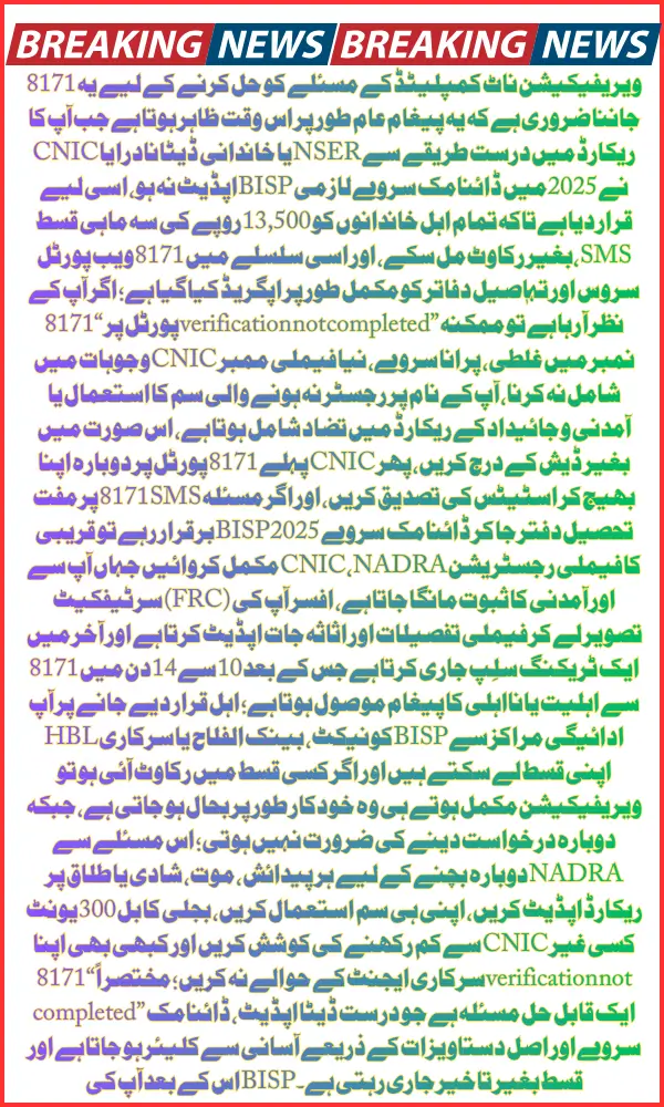The “8171 verification not completed” message is a common but fully solvable issue for BISP applicants. By updating NADRA information, completing the Dynamic Survey 2025, and ensuring correct CNIC and SIM details, beneficiaries can restore their eligibility and continue receiving financial support. A few simple steps ensure uninterrupted access to the Rs 13,500 quarterly installment that supports millions of low-income families across Pakistan.