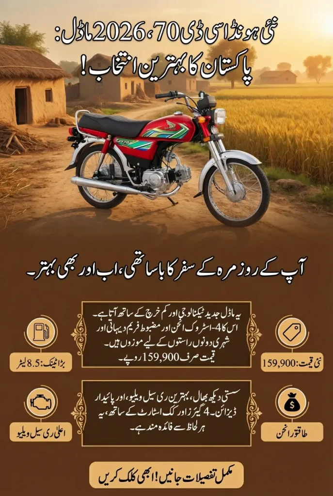 For buyers looking for a budget-friendly motorcycle with strong resale value and easy availability of spare parts, the CD 70 remains a sensible choice in the Pakistani market.