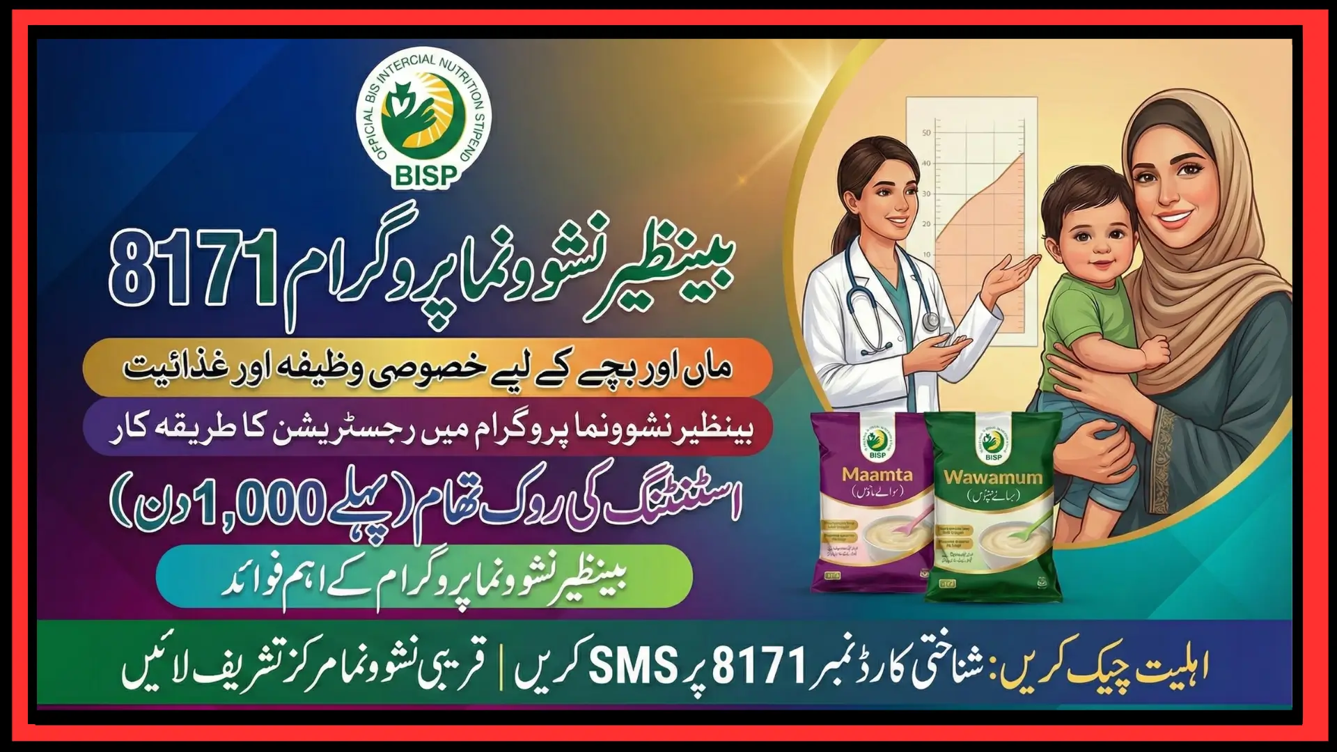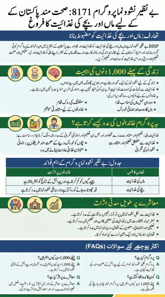 The Benazir Nashonuma Program 8171, a crucial initiative under the Benazir Income Support Program (BISP), is dedicated to improving the health and nutrition of mothers and young children across Pakistan. By targeting malnutrition and promoting proper dietary practices, the program aims to reduce health risks associated with poor nutrition, limited awareness, and lack of access to essential food resources. This initiative not only addresses immediate health needs but also lays the foundation for long-term growth and development in children and mothers. Families participating in the program gain access to practical guidance and nutritional support, which helps in fostering healthier communities.