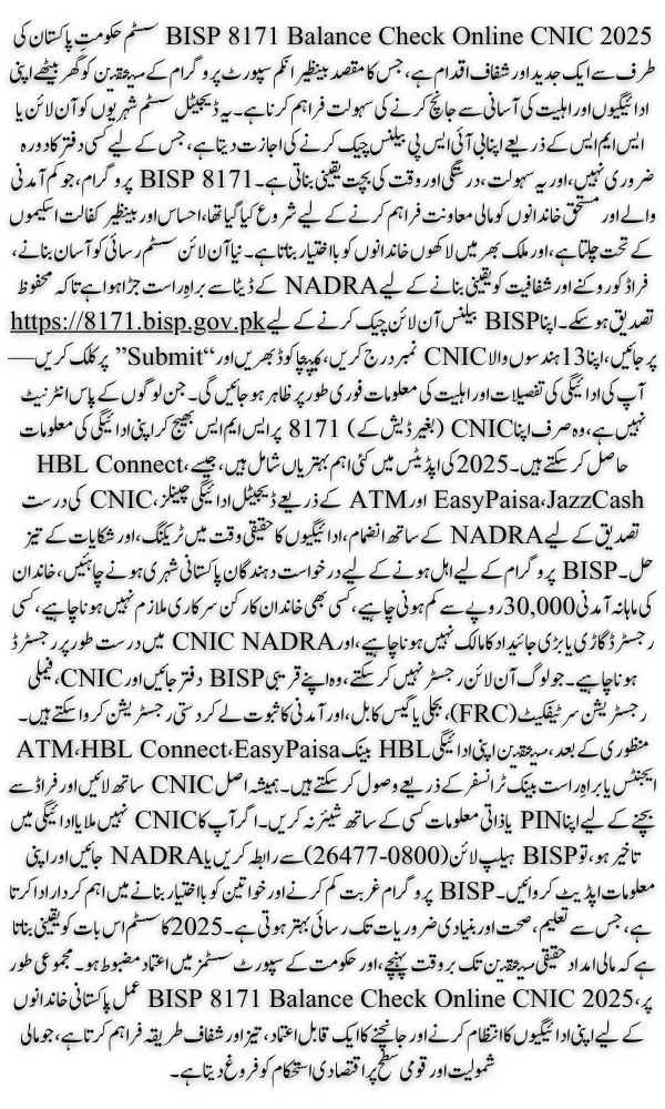 The BISP 8171 Balance Check Online CNIC 2025 system is one of the most efficient and transparent ways to verify your payment status and eligibility. With both online and SMS options, beneficiaries can easily track their funds and stay informed about updates from the comfort of their homes.