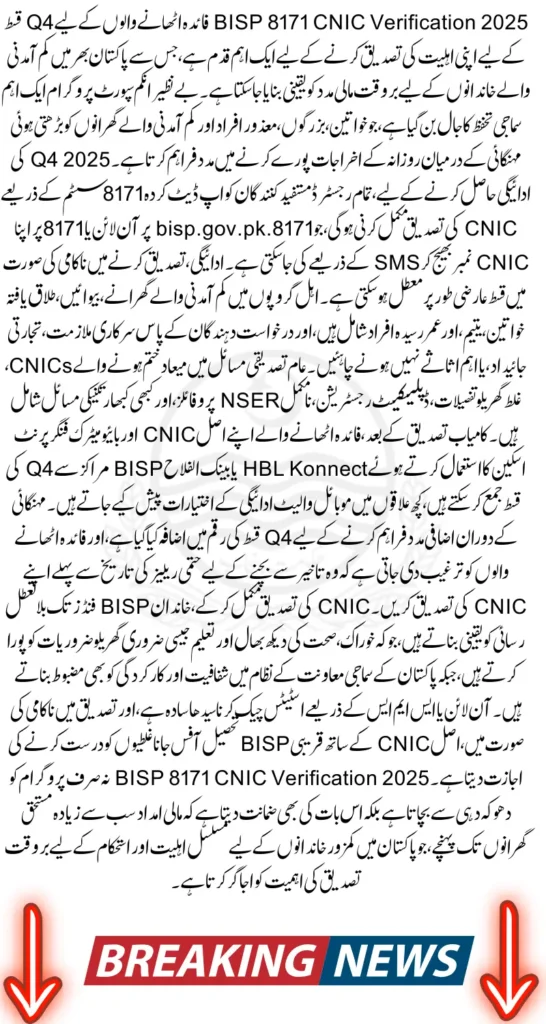 Completing BISP 8171 CNIC verification 2025 is essential to receive the Q4 installment on time. The verification process ensures accurate targeting of funds, protects against fraud, and helps families maintain financial stability. Beneficiaries are encouraged to verify their CNIC as early as possible to avoid delays and access the support they rely on.