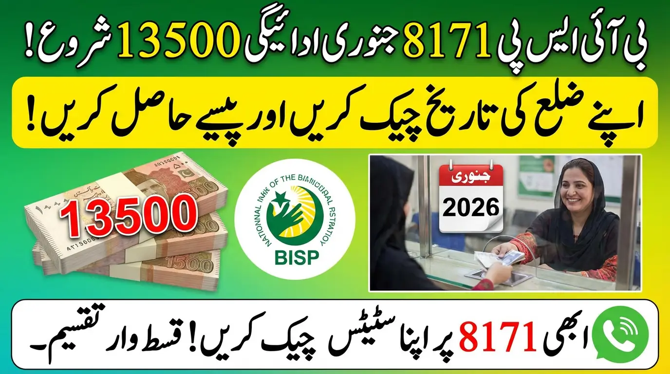 BISP 8171 January Payment 13500: The BISP 8171 January Payment 13500 has started across Pakistan under a phased and district-wise distribution plan. The Benazir Income Support Programme is releasing Rs 13,500 to eligible beneficiaries in January 2026, ensuring that payments reach families smoothly without overcrowding at centers. The phased approach helps prioritize high-need and flood-affected areas before expanding nationwide.