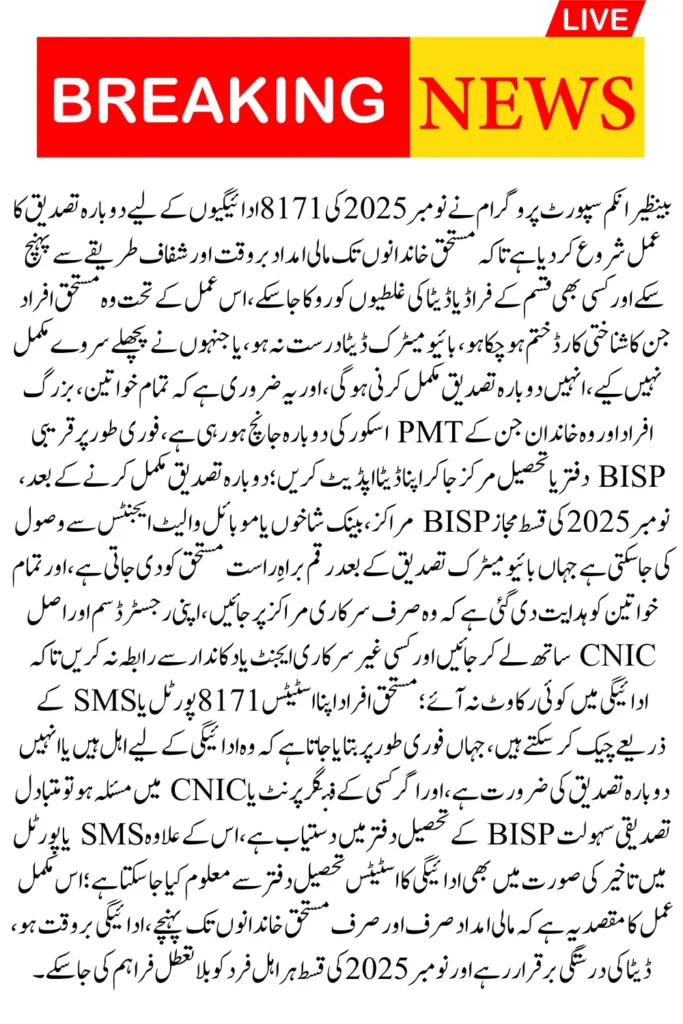 Once re-verification is completed, beneficiaries can receive their November 2025 payment through authorized BISP centers, bank branches, or mobile wallet agents. Biometric verification at the point of collection ensures that the allocated amount is provided directly to the rightful recipient, preventing unauthorized access or misuse.