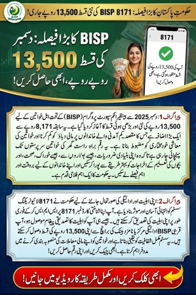 The Pakistan government has announced a significant update for the Benazir Income Support Programme (BISP). Starting this December 2025, eligible women will receive a new installment of Rs. 13,500 under the BISP 8171 program. This increase from the previous Rs. 8,171 aims to ease financial pressure on low-income families while strengthening support for women across the country.