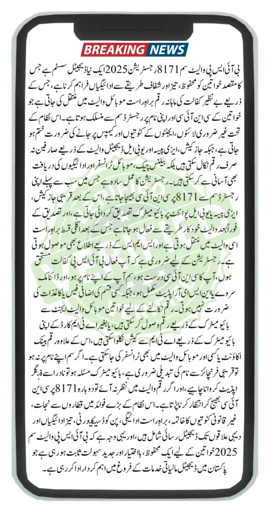 The BISP Wallet SIM 8171 Registration system is a major technological improvement designed to make BISP payments more secure, transparent, and convenient. By enabling direct transfers into mobile wallets and eliminating the need for physical payment centers, the system empowers women to manage their finances with greater control. With simple registration steps, multiple withdrawal options, and strong security features, this system is expected to provide long-term financial ease for millions of beneficiaries across Pakistan.