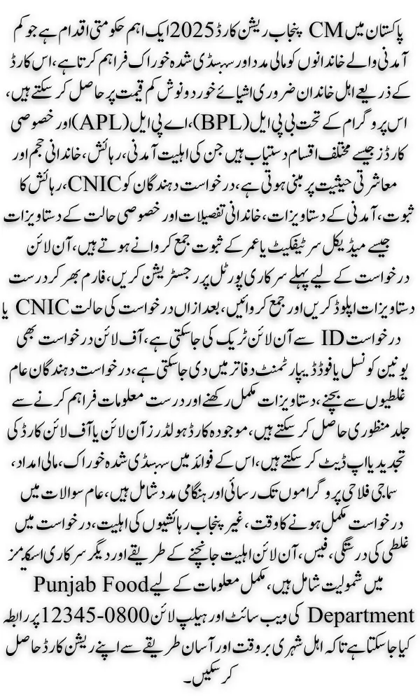 CM Punjab Ration Card Application 2025 is a vital government initiative designed to provide financial support and subsidized food supplies to low-income families across the province. This card ensures that eligible households have access to essential commodities at reduced prices, which is particularly crucial during economic hardships. Over the years, the government has streamlined the ration card system to make it more transparent and accessible, allowing citizens to apply both online and offline. The program not only helps in reducing household expenses but also supports social welfare by identifying and assisting deserving families. In 2025, the Punjab government will further update the registration process, ensuring quicker approvals and easier verification for applicants.