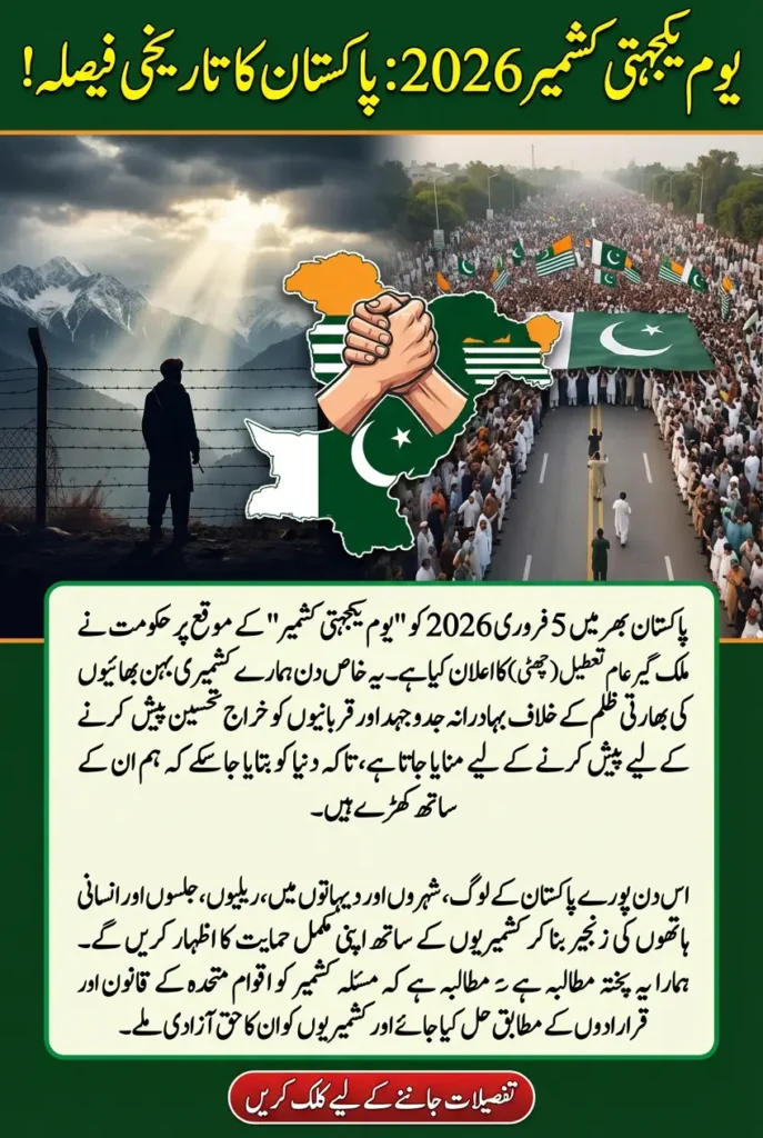 February 5 Kashmir Day holiday: Kashmir Solidarity Day 2026 will be observed across Pakistan on February 5, following the official declaration of a nationwide public holiday. This day is dedicated to honoring the long-standing struggle, sacrifices, and resilience of the Kashmiri people against Indian rule and oppression. The announcement reflects Pakistan’s continued moral, political, and diplomatic support for the Kashmir cause.