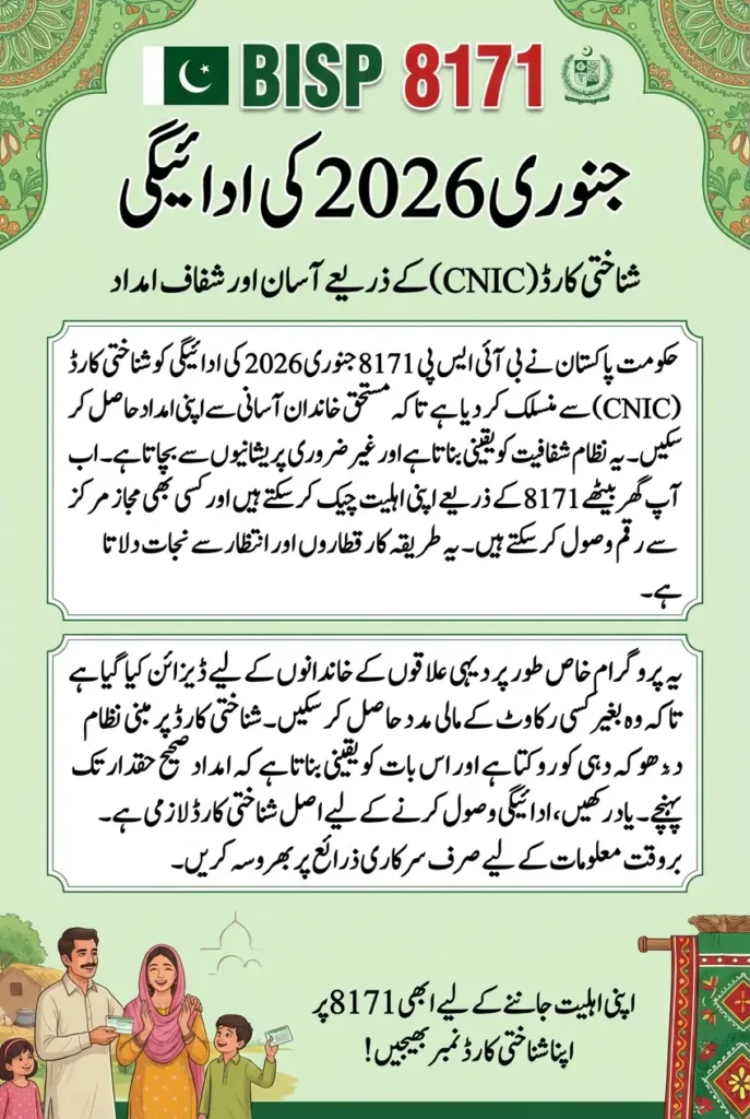 Using CNIC as the main verification tool makes the process easy for beneficiaries. Instead of repeated visits to offices, applicants can check eligibility through the 8171 system and then collect payments from authorized centers. The January 2026 payment cycle continues this streamlined method to improve convenience and trust.