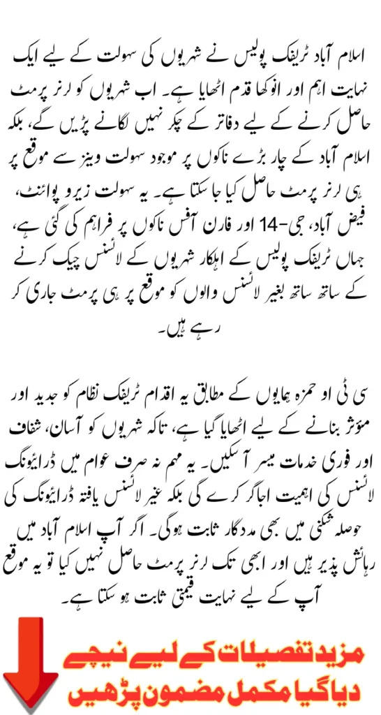 By providing easy access to learner permits, the traffic police aims to create a culture of responsibility. And awareness among Islamabad’s motorists. It also marks another step toward building a smart and modern capital where citizens can access government services without unnecessary delays.