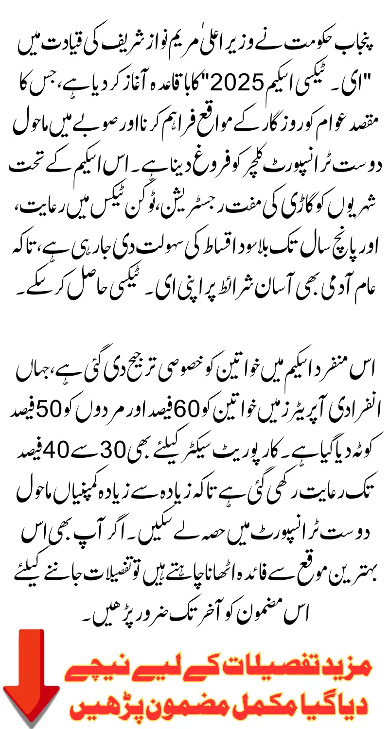 The scheme is specially designed to empower women and encourage their participation in the transport sector. For individual operators, women are given a 60% quota, while men receive 50%. This clear preference for female drivers reflects Chief Minister Maryam Nawaz’s commitment to women’s empowerment and financial independence.