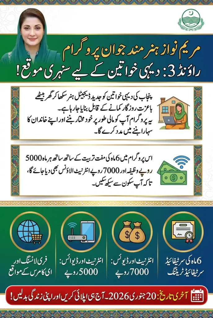 The Maryam Nawaz Hunarmand Jawan Program Round 3 is a landmark initiative for empowering rural women in Punjab. By offering certified digital training, financial support, and career opportunities, the program helps women achieve financial independence and professional growth. Interested candidates should apply before January 20, 2026, to participate in this transformative program.