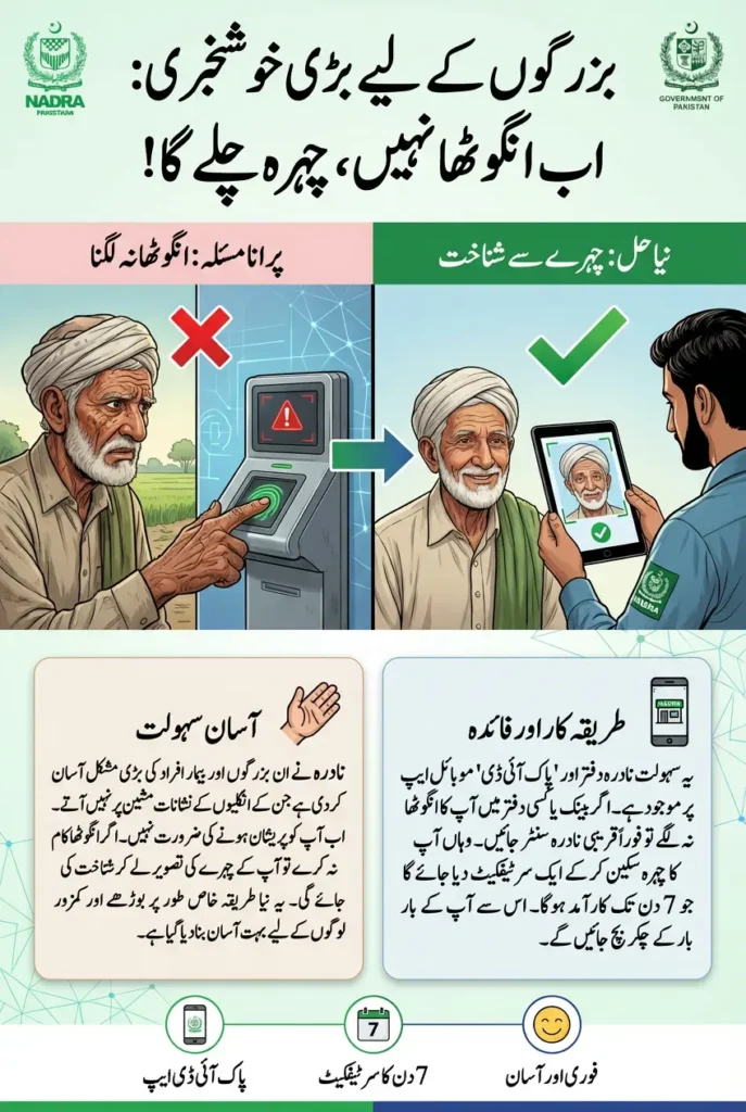 Citizens who are unable to verify fingerprints can follow a simple process to obtain verification through facial recognition. After visiting a NADRA registration center, officials will complete the facial recognition scan and issue the certificate once verification is successful.