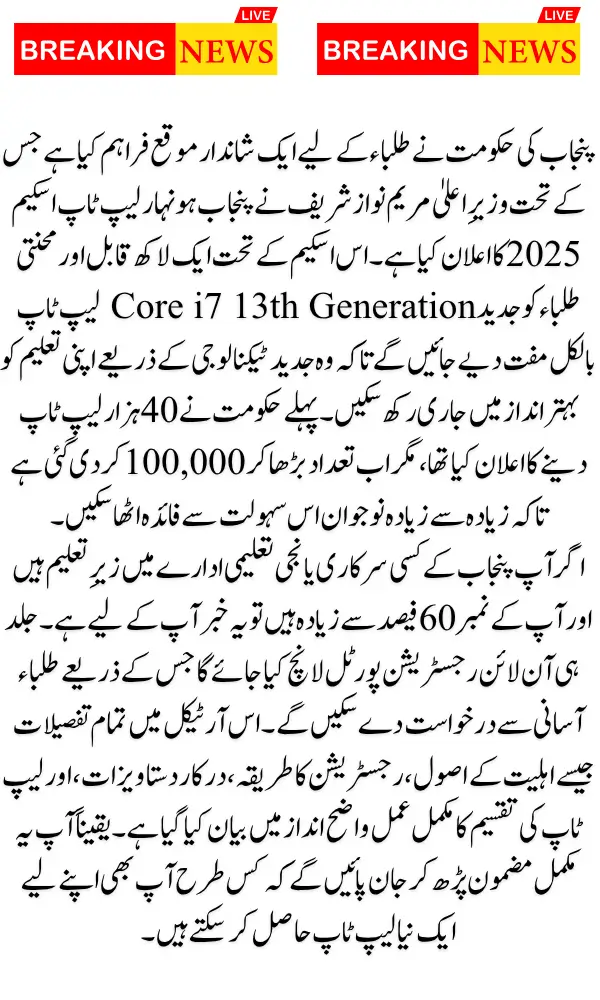 The Punjab government has once again taken a big and encouraging step for students across the province. Under the leadership of Chief Minister Maryam Nawaz Sharif, the Punjab Honhaar Laptop Scheme 2025 has been officially announced. This program aims to distribute the latest Core i7 13th Generation laptops free of cost among deserving students so that they can continue their educational journey with access to modern technology.