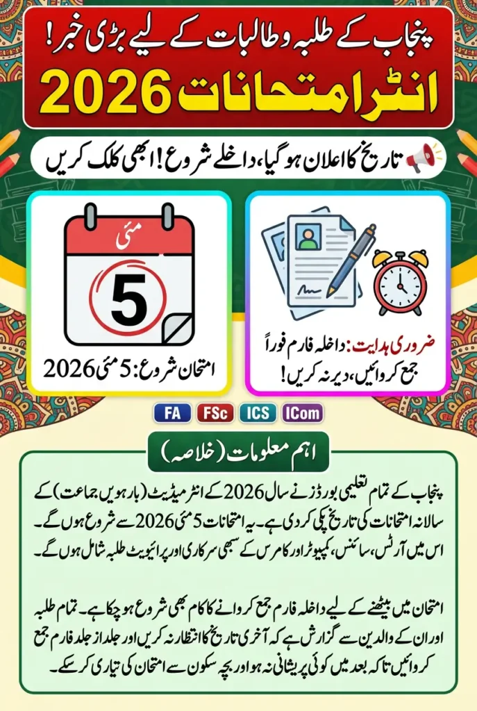All Intermediate exams in Punjab, including FA, FSC, ICS, and ICom, will start on May 5, 2026. This start date applies to all recognized colleges and educational institutions in the province. By setting a fixed date, the education boards aim to streamline the examination process and provide uniformity across Punjab.