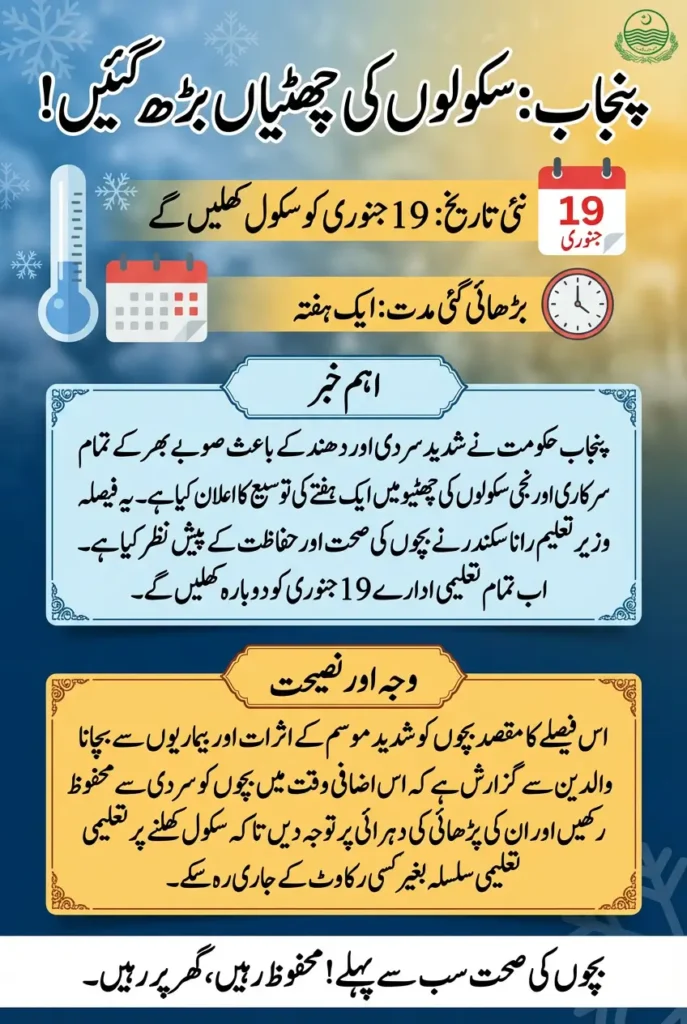 The extension of Punjab school holidays provides students with additional time to stay safe during extreme winter conditions. With schools reopening from January 19, both students and parents are encouraged to plan accordingly and prioritize health. This decision underlines the government’s commitment to balancing education and student welfare.
