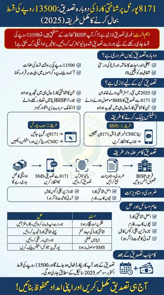 Once the confirmation message is received from 8171, your record becomes active again in the BISP database. Your Rs. 13,500 installment will then be issued according to the October–December 2025 payment cycle. Relief funds will be transferred through official payment centers or bank agents linked with the BISP system.